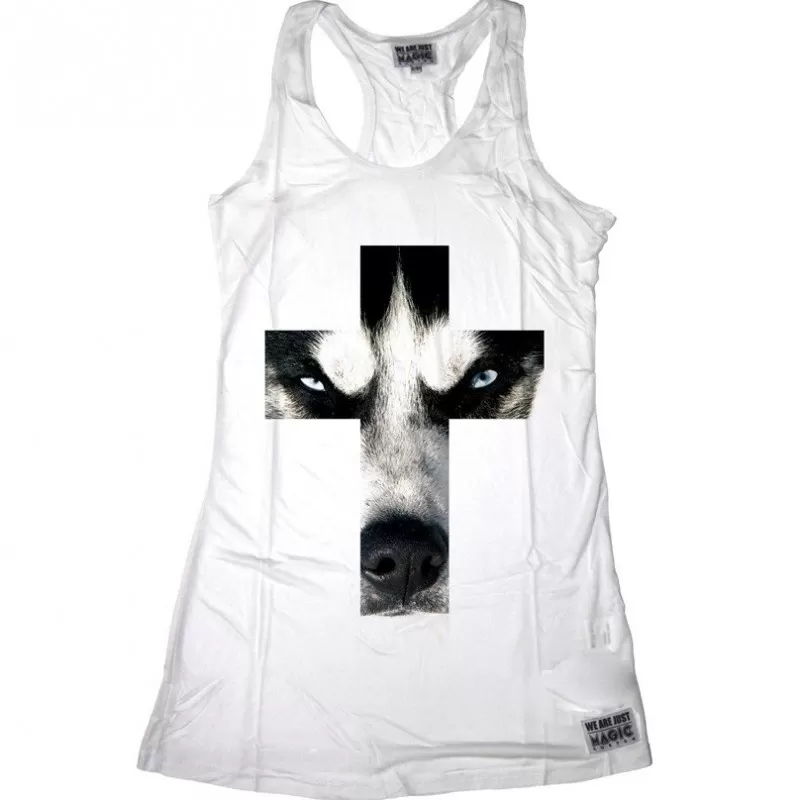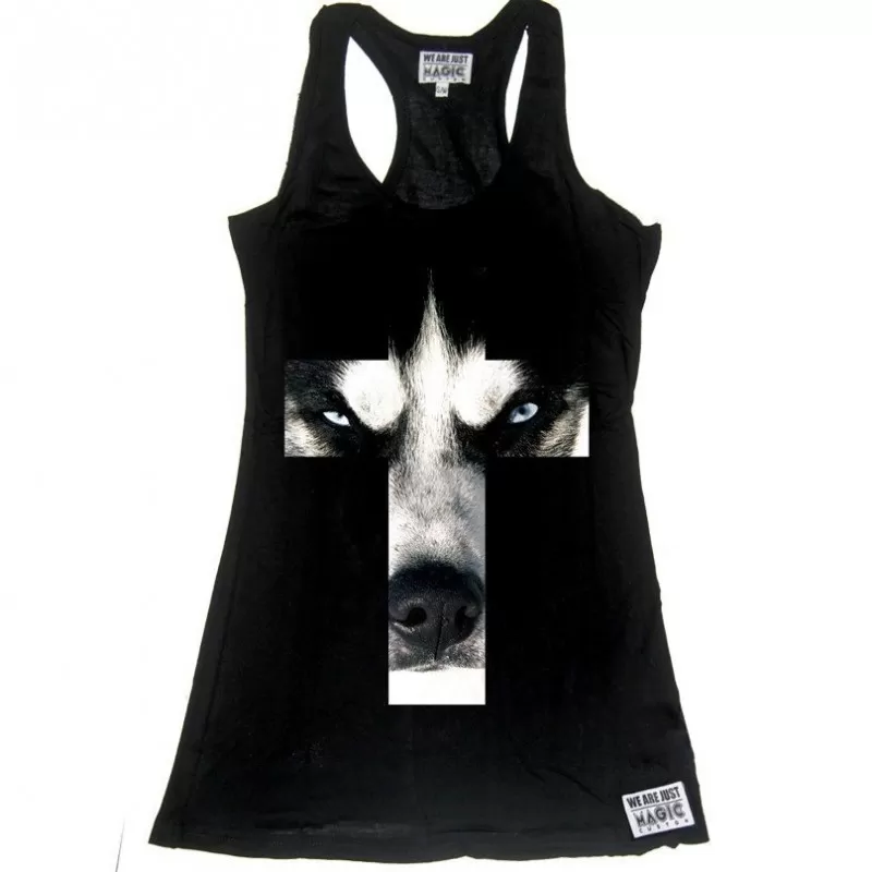 Debardeur femme de couleur noir avec illustration ‘ANIMAL CROSS HUSKY’ imprimé sur l’avant du vêtement