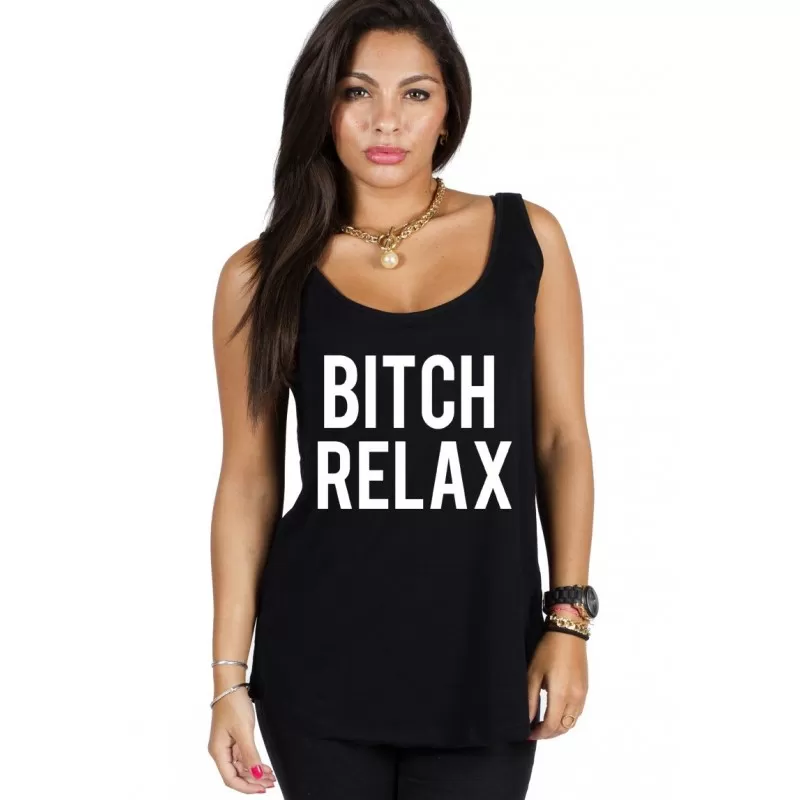 Debardeur femme de couleur noir avec illustration ‘Bitch Relax’ imprimé sur l’avant du vêtement
