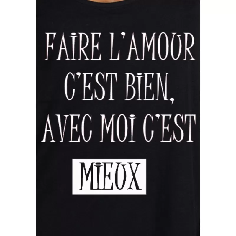 Debardeur femme de couleur noir avec illustration ‘Faire l’amour c’est bien avec moi c’est mieux’ imprimé sur l’avant du vêtement