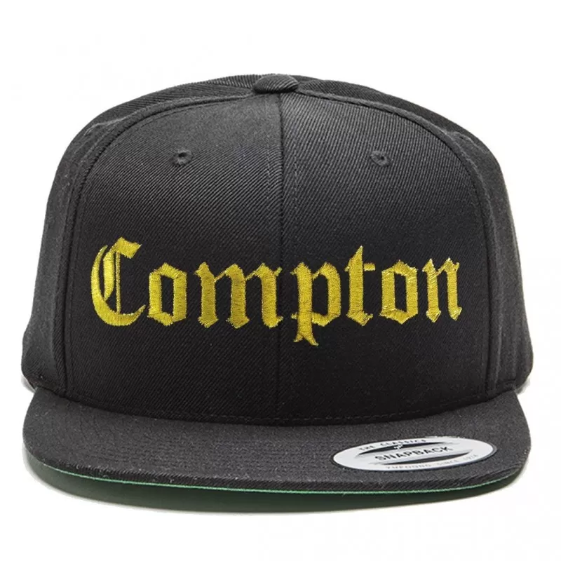 Casquette snapback de couleur noire avec broderie ‘COMPTON’ en doré sur l’avant