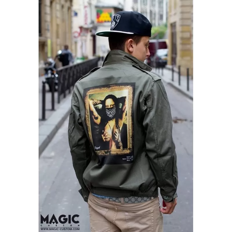 Veste Militaire customisée par MAGIC CUSTOM avec illistration ‘ DIRTY LISA’ imprimé dans le dos du vêtement