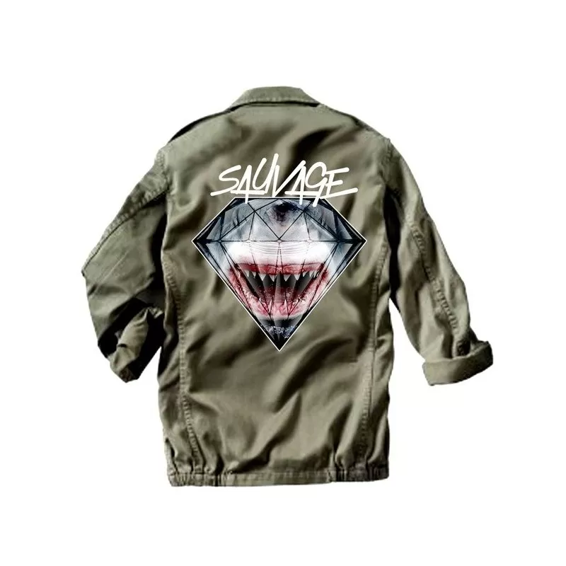Veste Militaire customisée par MAGIC CUSTOM avec illistration ‘ REQUIN’ imprimé dans le dos du vêtement