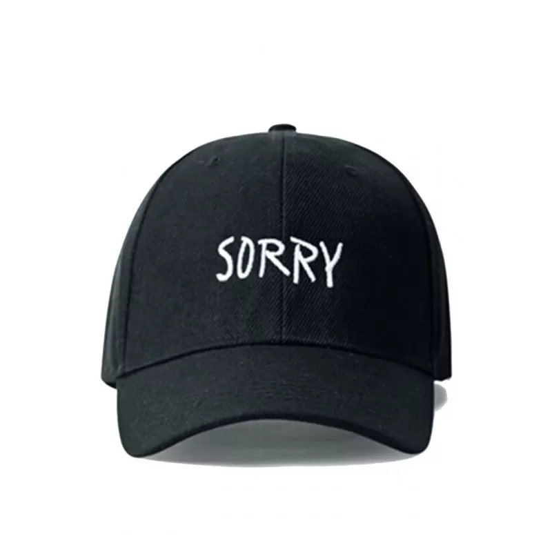 Casquette sporback de couleur noire avec broderie ‘Sorry’ en blanc